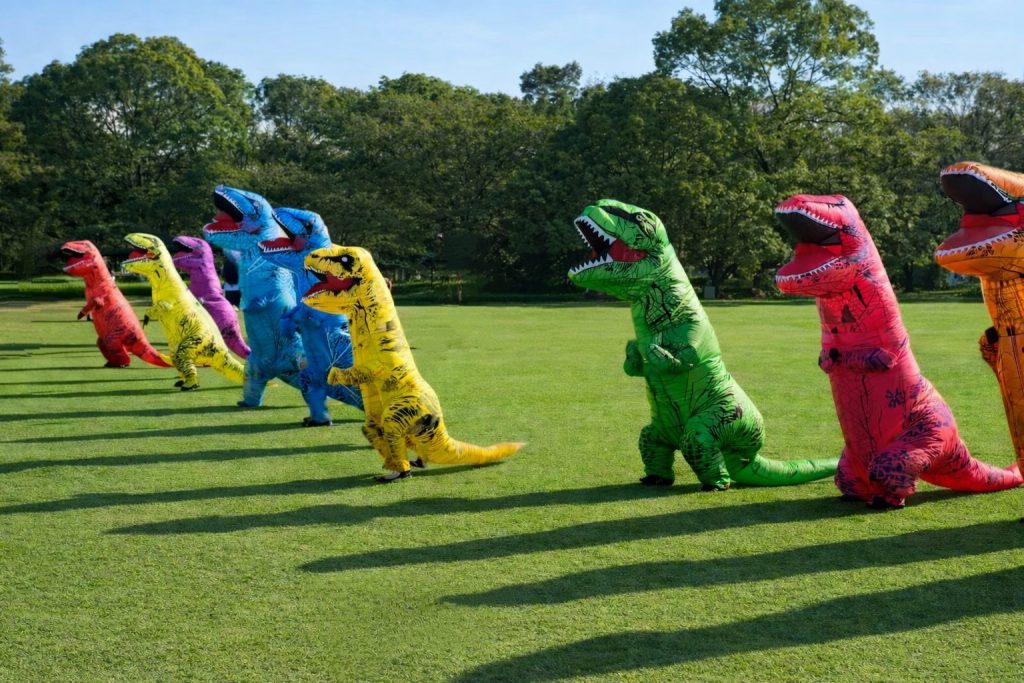 ティラノサウルスの着ぐるみでかけっこにチャレンジ!